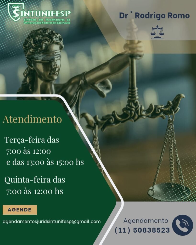 Plantão jurídico para associados do SINTUNIFESP Dr. Rodrigo Romo